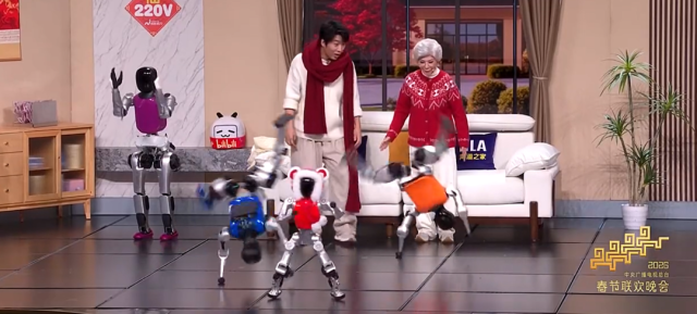 机器人是今晚的重头戏,也是春晚史上,机器人表演阵容最庞大的一次。继开场表演和明星合唱后,接下来的三个节目(包含小品、歌舞、动作类)均有国产人形机器人参与,展现的不止是机器人精准的运动控制能力,还有自然交互能力。