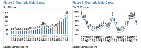 Meta的情况同样不容乐观。其2026年资本支出预计增长75%至1150亿-1350亿美元。虽然不像亚马逊那样直接“入不敷出”,但这笔巨额开支将几乎“抹平”Meta的自由现金流,使其曾经的游刃有余财务状况变得捉襟见肘。